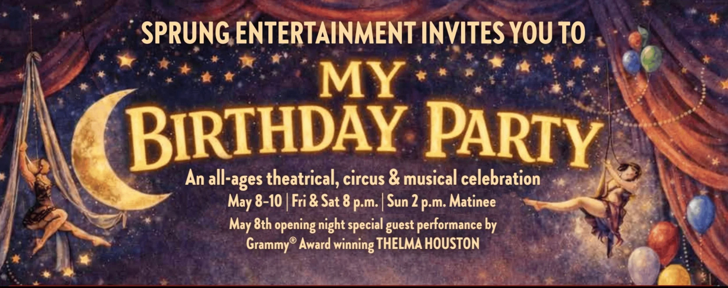 “My Birthday Party” is a joyous, all-ages, live spectacle that sweeps you off your feet! Acrobats, aerialists, and clowns from Cirque du Soleil in a fantastical celebration of life that reminds everyone in the room why it feels so good to be alive!
